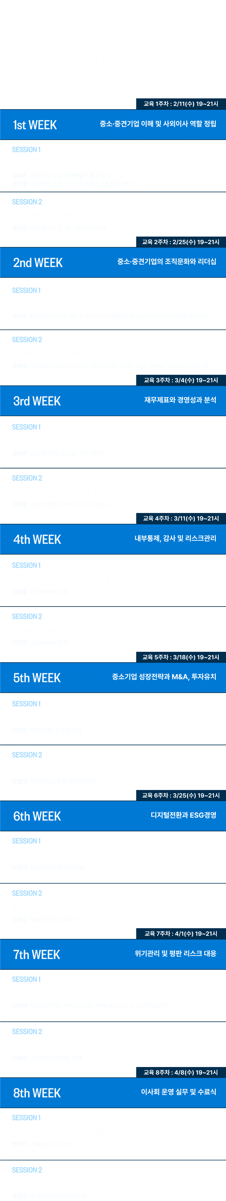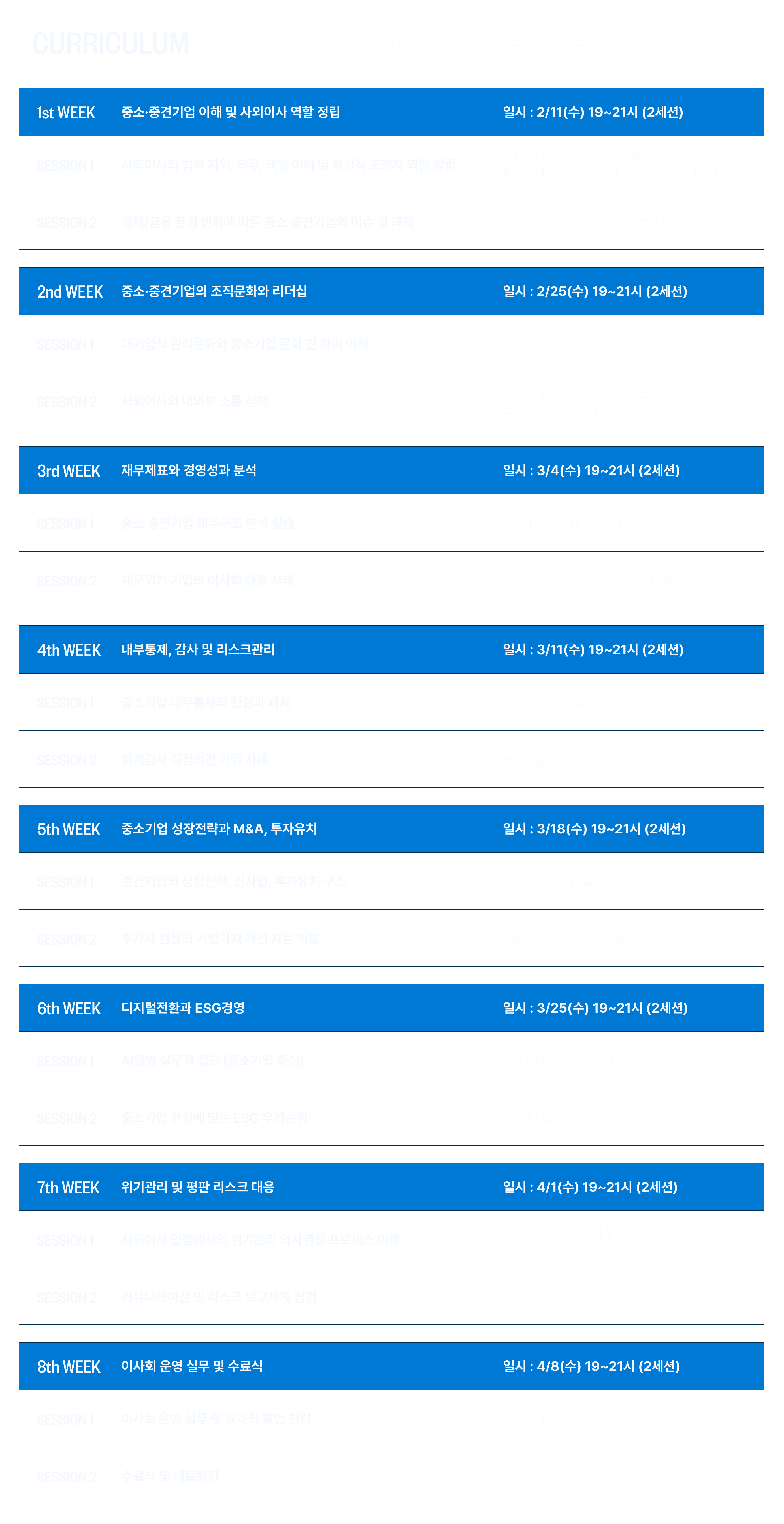 교육 목표 : 중소·중견기업의 현실적 경영 구조와 조직 문화를 이해하고 이사회 관점의 실전형 사외이사 역량을 강화합니다.